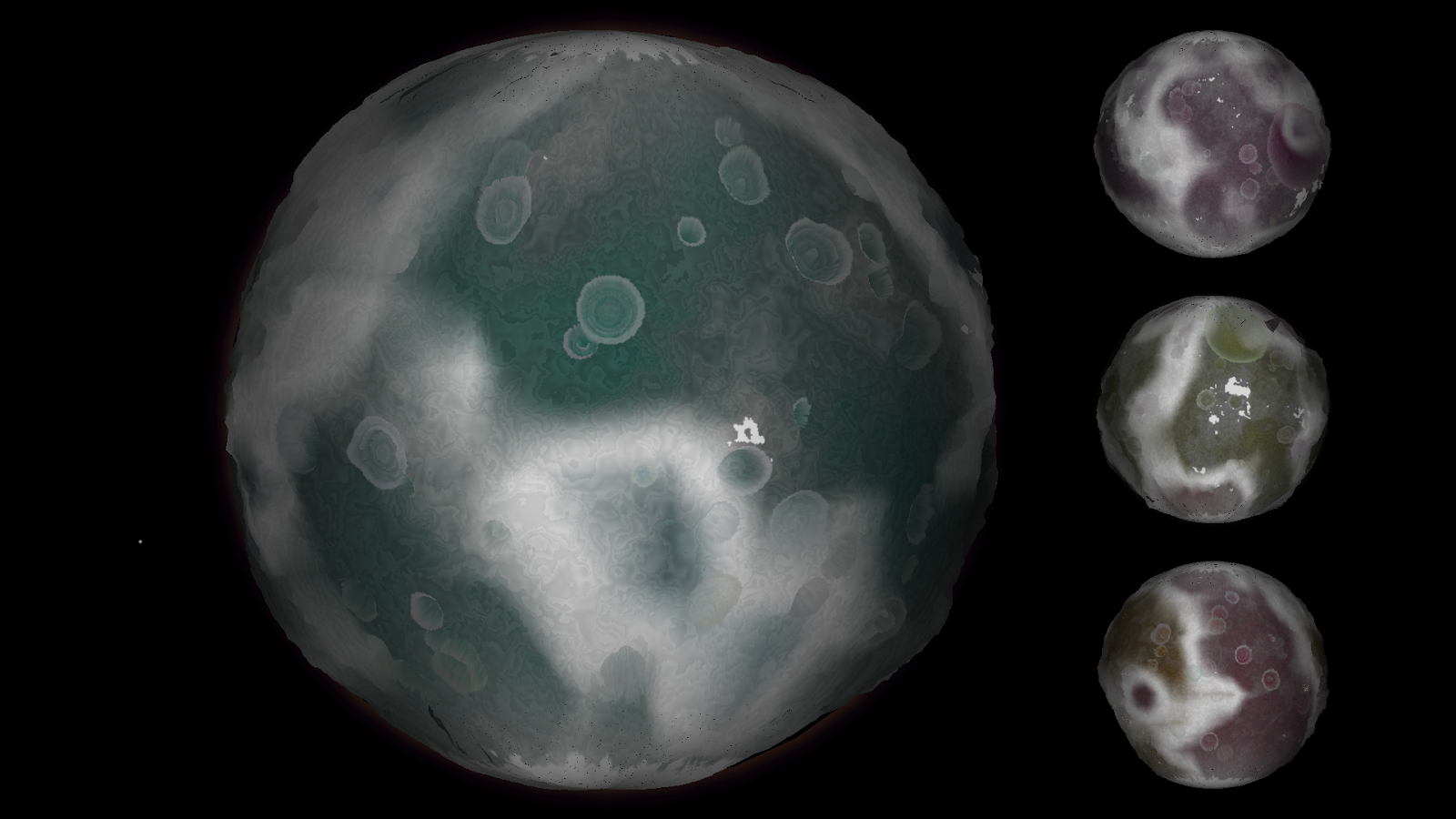 This type of planet has a fixed colour palette - light lines seperating dark areas of two different colours. This system is the very same used for the "biomes" of Terra planets, just to show how effectful a simple randomly applied colour palette can be.